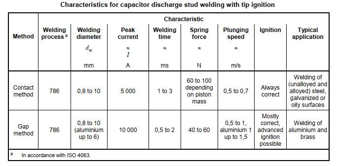 2.) Short-cycle drawn-arc stud welding (784). A welding time of u 100 ms is used. This variant is suitable for stud diameters up to 12 mm, but for the range between approximately 8 mm and 12 mm, stud diameter shielding gas should be used to prevent increased pore formation. For aluminium, shielding gas shall be used. The fusion zone is narrow and the thermal input modest, so that studs up to 12 mm diameter can be welded to thin sheets. For diameters up to 9 mm diameter and with steel, the operation is frequently carried out without protection of the weld pool and calls for studs with an upset flange, as these afford a larger weld area than the plain stud-shaft diameter and thus reach a higher tensile force than the stud shaft, despite pores in the weld zone. The minimum sheet thickness is 0,125 d, but not less than 0,6 mm.3.) Capacitor discharge drawn-arc stud welding (785). Very short welding time (< 10 ms) can be achieved by using a capacitor discharge power source. The diameter range is 3 mm to 10 mm. The minimum sheet thickness is 0,1 d, but not less than 0,5 mm. The welding process