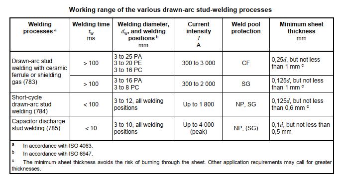 1.) Drawn arc stud welding with ceramic ferrule or shielding gas (783).This welding process is generally used in the 3 mm to 25 mm diameter range, with welding times of 100 ms to 3000 ms. It is usually carried out with a ceramic ferrule or shielding gas, or with both, or in special cases without pool protection. Thismethod is used for the majority of applications. The minimum sheet thickness is 0,25 d for CF and 0,125 d for SG, but not less than 1 mm.