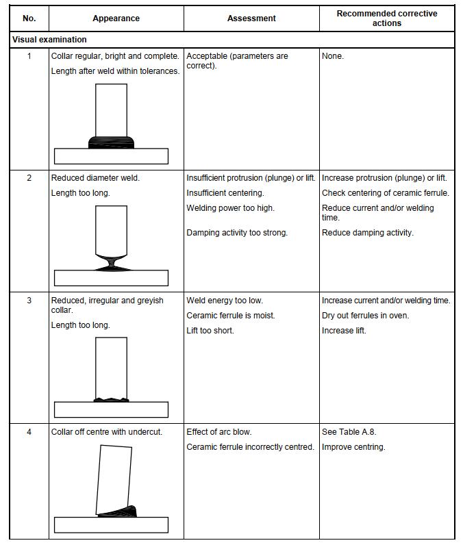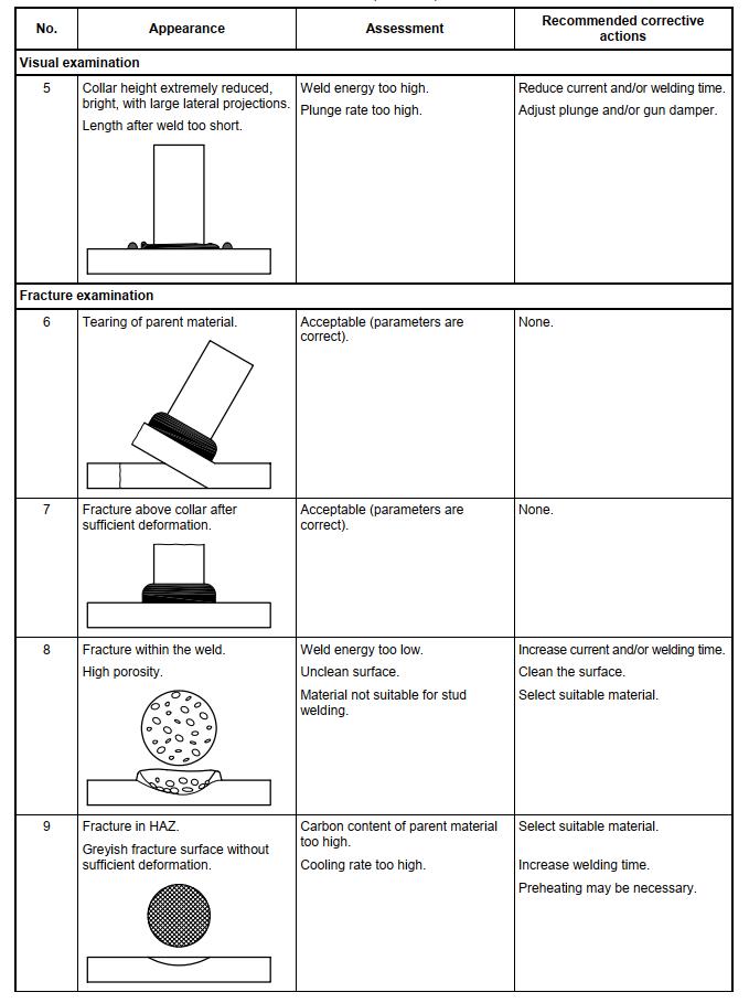 Weld assessment and recommended corrective actions for drawn arc stud welding with ceramic ferrule or shielding gas