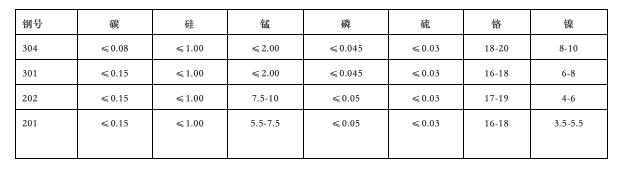 不銹鋼在冶煉過程當(dāng)中,由于加入合金元素品種不同,不同品種加入量的不同。其特性也是不同的,為了加以區(qū)別則冠上了不同的鋼號,下面是常見裝飾用不銹鋼不同鋼號“合金元素”含量表僅供參考: